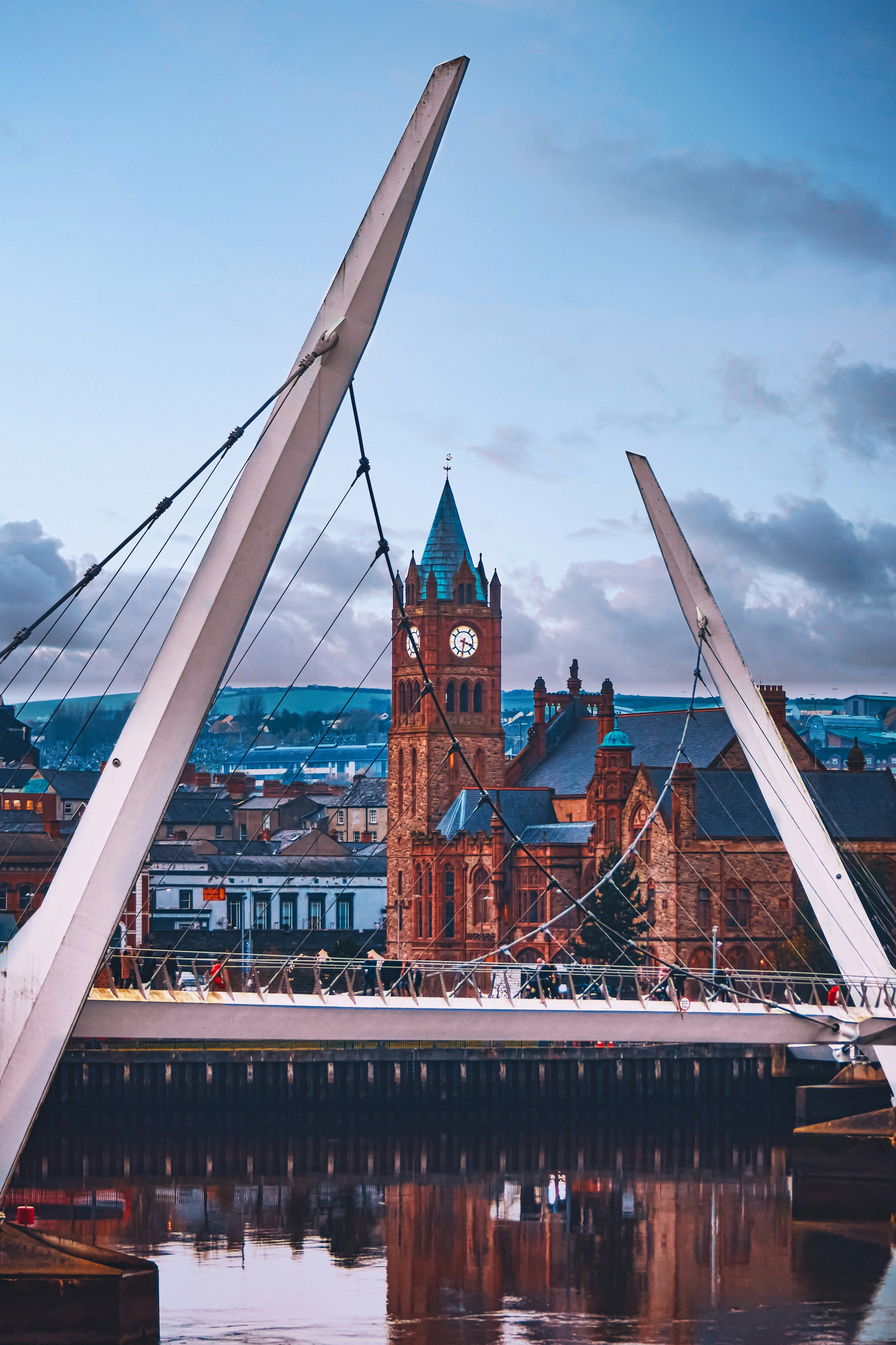The Guild Hall framed by the Peace Bridge over the River Foyle on a late afternoon autumnal day (Oct., 2019).