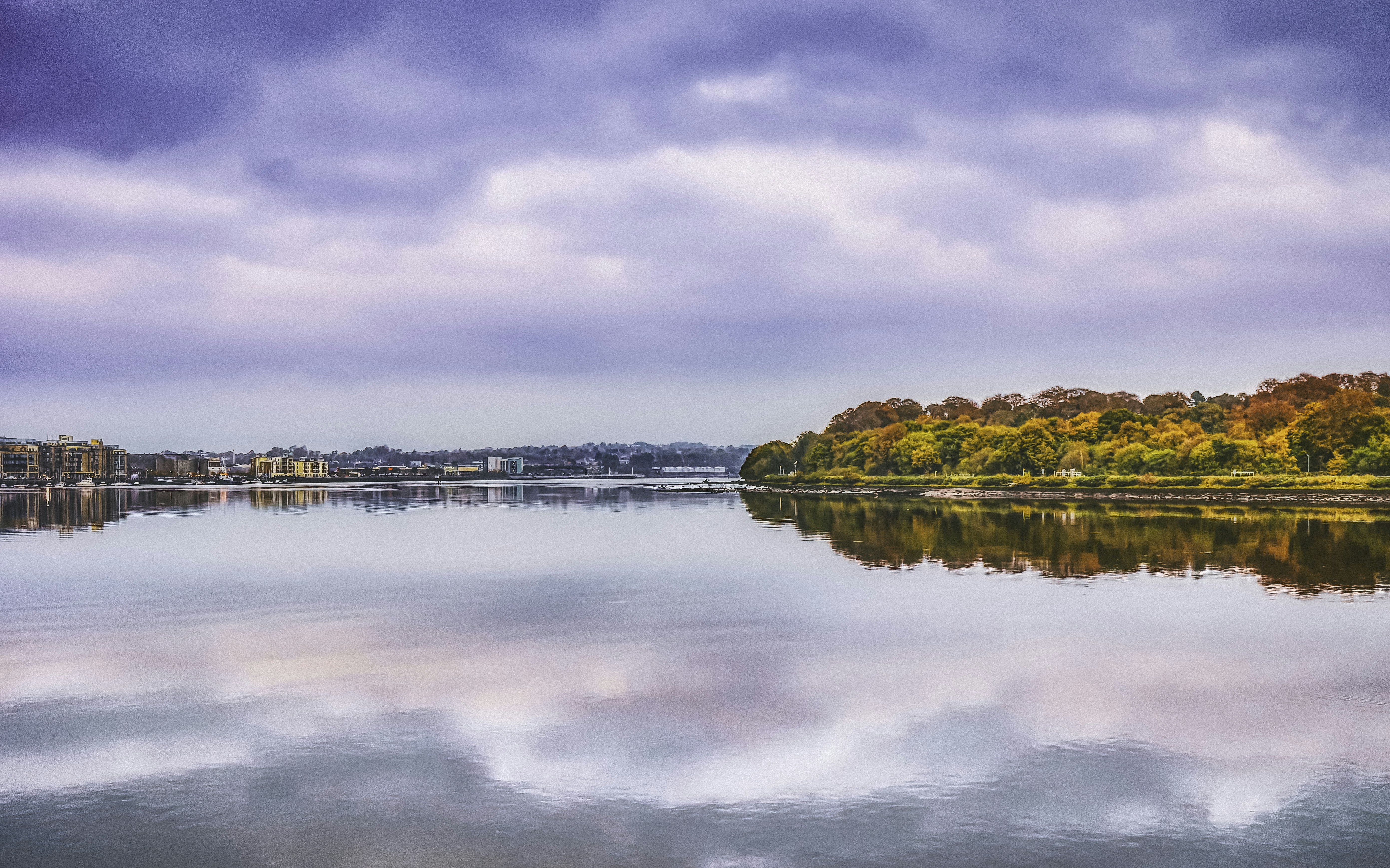 A calm River Foyle flows between the bright autumn trees at St. Columb's Park on the Waterside and the Cityside of Derry, Northern Ireland (Oct., 2019).
